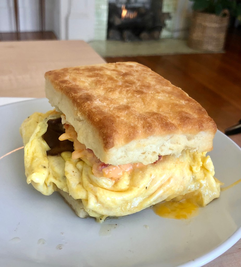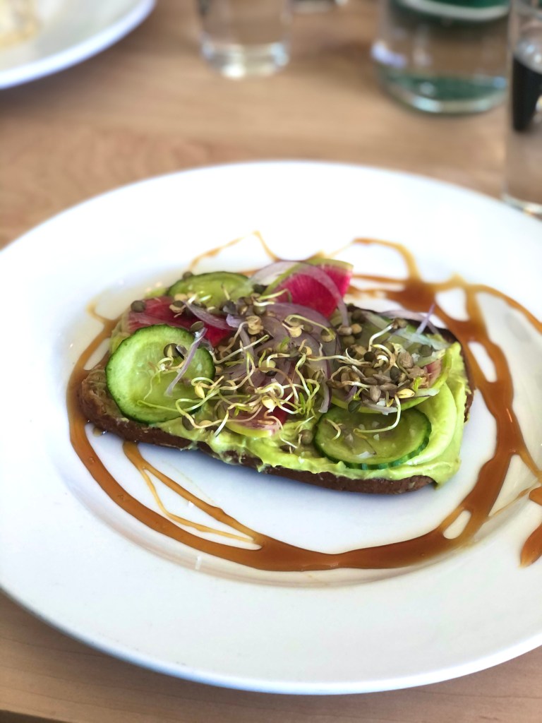 Water was waiting on the table for us, a smart move in my opinion! The menu was small, but packed with goodies like West Coast Toast, Quiche, Biscuits, and more. I ordered the West Coast Toast which was one slice of wheatberry bread topped with avocado butter, radishes, sprouts, cucumbers, onions, sunflower seeds, and what they called B & B reduction. I don’t know what that was, but it was a sweet and tasty compliment to the toast! My husband and friend’s husband both ordered a generous square biscuit with egg, bacon, and pimento cheese and boy, did they love it! My friend ordered the biscuit and gravy with an egg. I loved the attention to detail that each dish offered- you can really tell these people love what they do!