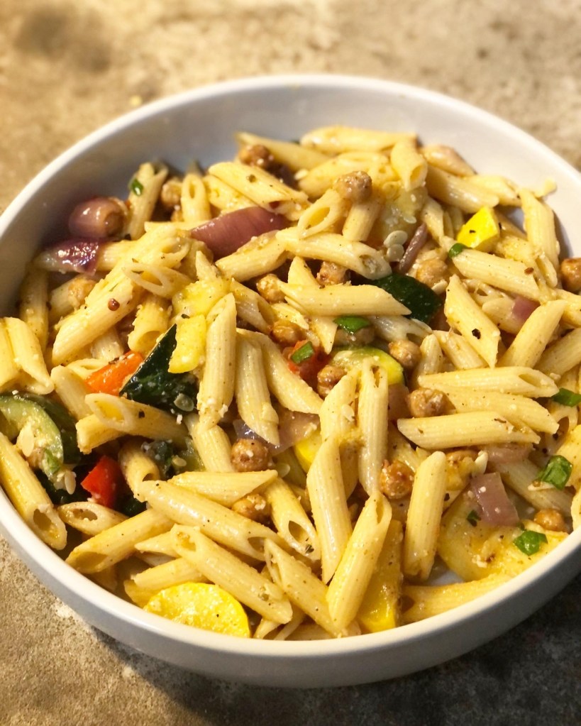 It’s no secret that pasta is a favorite food around here. One look at the Foodie Instagram page can tell you that we are devout pasta lovers. This dish combines our love of pasta and veggies in one delicious recipe! With it’s tangy dressing, crunchy chickpeas, and warm vegetables, you are sure to love it as much as we do!