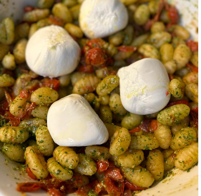 Next, you can either make pesto or use the store bought. (If you want to make it yourself, just blend about 2 cups of fresh basil, half a cup of Parmesan, fourth cup of olive oil, half a clove of garlic, and a pinch of salt…and the juice of half a lemon if you have it!) Combine everything when the gnocchi and veggies are done and top with a few delicious burrata pieces. Enjoy!